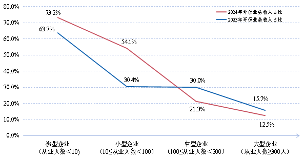 從企業(yè)規(guī)模看,大、中、小、微型企業(yè)年?duì)I業(yè)收入占被調(diào)查企業(yè)總營(yíng)收的比例分別為86.2%、9.3%、4.5%和0.1%,大型企業(yè)數(shù)量最少,但對(duì)環(huán)??偁I(yíng)收的貢獻(xiàn)最大,小微企業(yè)數(shù)量較多,但產(chǎn)出貢獻(xiàn)較小。根據(jù)統(tǒng)計(jì)結(jié)果,統(tǒng)計(jì)范圍內(nèi)企業(yè)營(yíng)業(yè)收入總額約563.96億元,其中環(huán)保業(yè)務(wù)營(yíng)業(yè)收入約85.80億元,在總營(yíng)業(yè)收入中占比15.2%。從企業(yè)類型看,2024年大、中、小、微型企業(yè)環(huán)保業(yè)務(wù)收入占對(duì)應(yīng)類別年?duì)I收總額比重分別為12.5%、21.3%、54.1%和74.7%,2023年相同指標(biāo)分別為15.7%、30.0%、30.4%和63.7%。由此可見(jiàn),