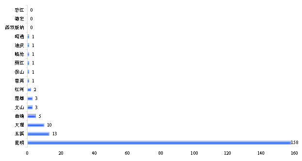 統(tǒng)計(jì)范圍內(nèi)的200家環(huán)保企業(yè)地域分布高度集中,滇中城市群聚集了調(diào)查范圍內(nèi)90.5%的企業(yè),共計(jì)181家,主要分布在昆明、玉溪、楚雄、曲靖四座城市,其中昆明環(huán)保企業(yè)158家,占統(tǒng)計(jì)企業(yè)總數(shù)的79.0%。