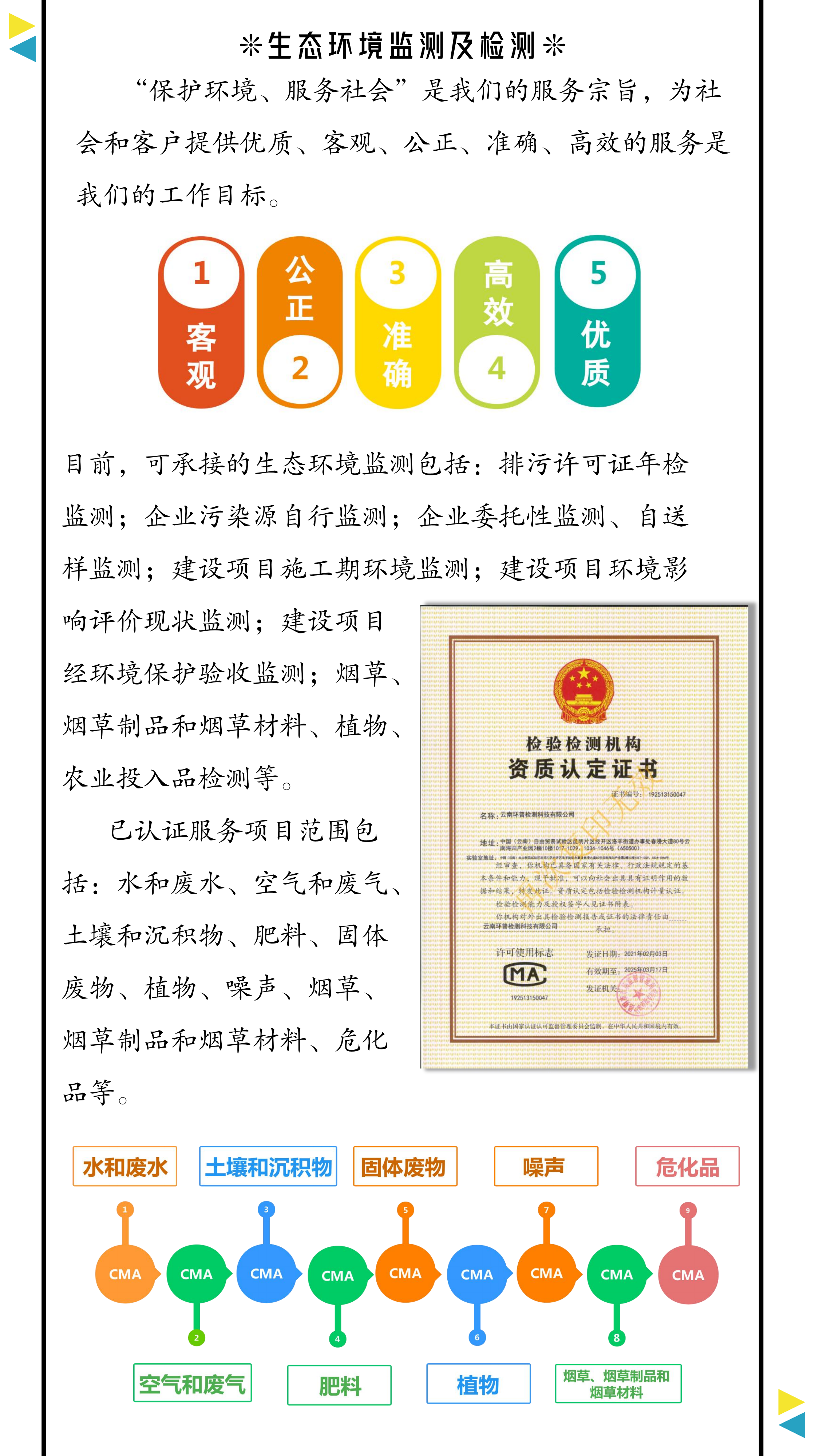 檢測(cè)范圍包括:排污許可證年檢監(jiān)測(cè);企業(yè)污染源自行監(jiān)測(cè);企業(yè)委托性監(jiān)測(cè)、自送樣監(jiān)測(cè);建設(shè)項(xiàng)目施工期環(huán)境監(jiān)測(cè);建設(shè)項(xiàng)目環(huán)境影響評(píng)價(jià)現(xiàn)狀監(jiān)測(cè);建設(shè)項(xiàng)目經(jīng)環(huán)境保護(hù)驗(yàn)收監(jiān)測(cè);煙草、煙草制品和煙草材料、植物、農(nóng)業(yè)投入品檢測(cè)等