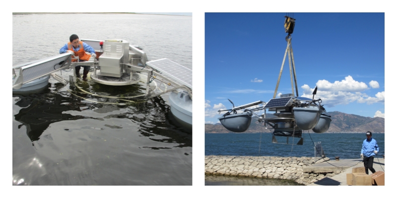 水上對太陽能驅(qū)動水生生態(tài)設(shè)備進(jìn)行調(diào)試,以確保設(shè)備能夠正常運(yùn)行