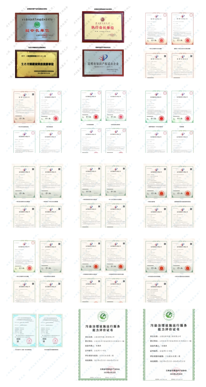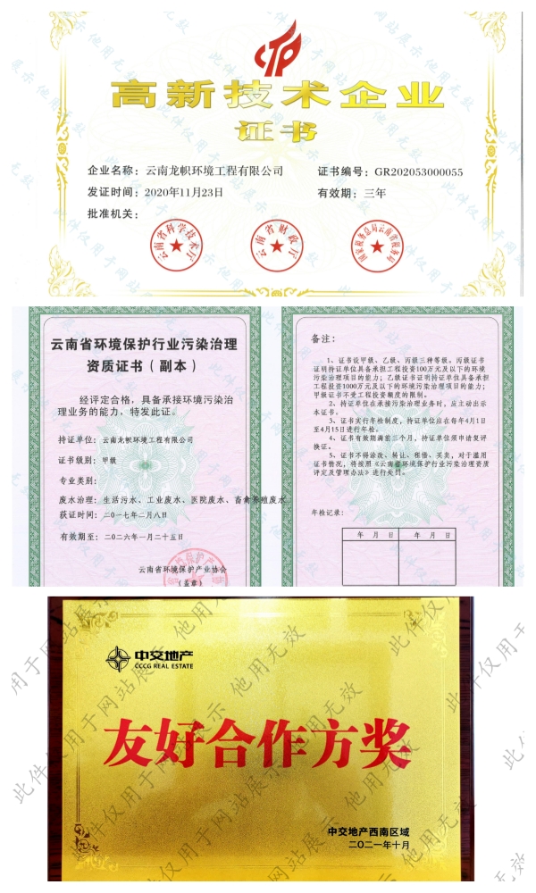 公司持有環(huán)保工程專業(yè)承包二級、市政公用工程總承包三級、建筑工程總承包三級、污染治理乙級、污染治理設(shè)施運(yùn)行服務(wù)二級資質(zhì)證書。前后獲得“十二五”生態(tài)文明建設(shè)突出貢獻(xiàn)單位、云南省省級成長型中小企業(yè)、云南省知識產(chǎn)權(quán)優(yōu)勢企業(yè)、云南省科技型中小企業(yè)、云南省專精特新中小企業(yè)、招商蛇口最佳合作伙伴、中交置業(yè)友好合作方獎等榮譽(yù)。
