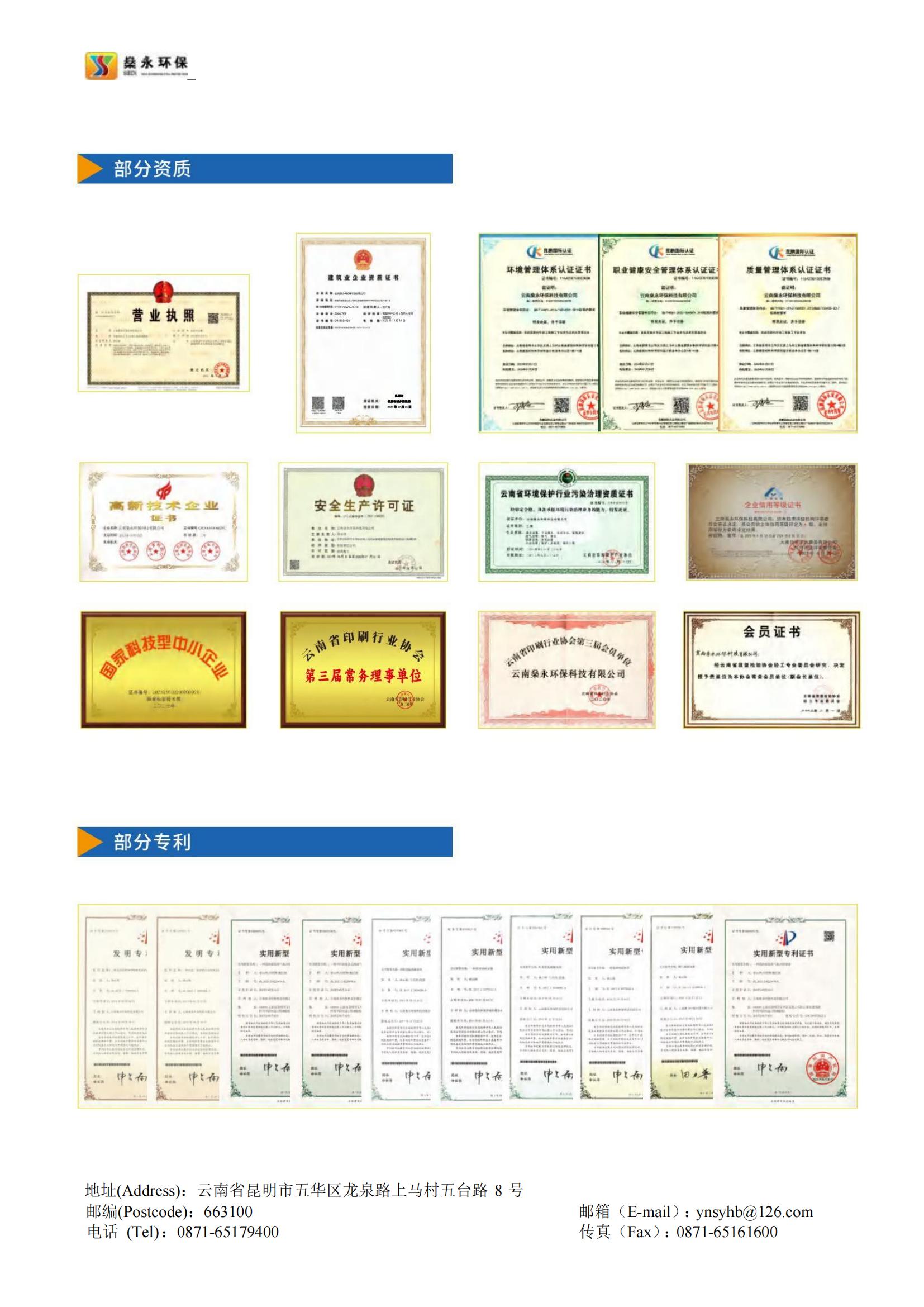 燊永公司堅(jiān)持“創(chuàng)新、協(xié)作、共贏”的價(jià)值觀,以“專業(yè)、專心、專注”為服務(wù)理念,以“求實(shí)、求是、求精”為質(zhì)量宗旨,為客戶提供優(yōu)質(zhì)、高效、貼心的服務(wù)。公司獲得國(guó)家專業(yè)部門頒發(fā)的《環(huán)境工程專業(yè)承包三級(jí)》資質(zhì)、《污染治理乙級(jí)》資質(zhì)、《企業(yè)信用等級(jí)A級(jí)》證書、《云南省科技型中小企業(yè)》認(rèn)定證書、《ISO9001/GBT50430質(zhì)量管理體系》證書、《ISO14001環(huán)境管理體系》證書、《ISO45001職業(yè)健康安全管理體系》證書等多項(xiàng)榮譽(yù)和多項(xiàng)的專利技術(shù)。
