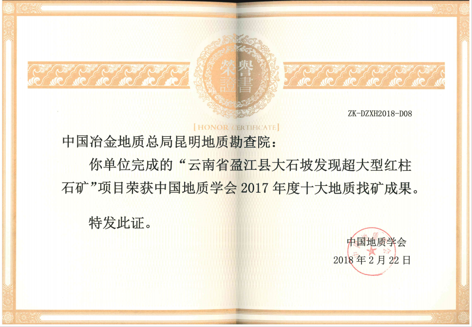 2018年2月22日,昆明地質(zhì)勘查院完成的“云南省盈江縣大石坡超大型紅柱石礦”項(xiàng)目獲得中國地質(zhì)學(xué)會(huì)2017年度“十大地質(zhì)科技進(jìn)展、十大地質(zhì)找礦成果”獎(jiǎng)。